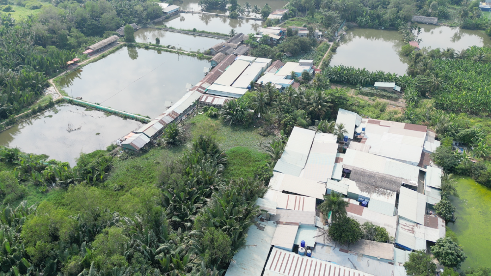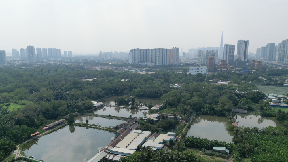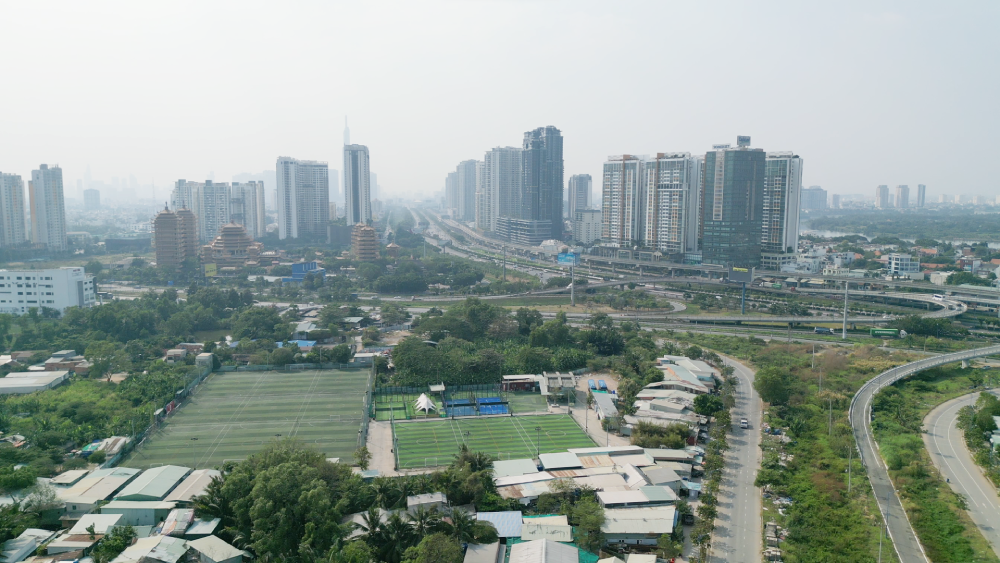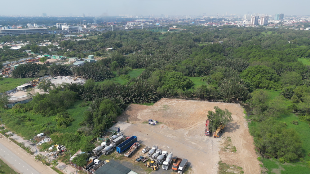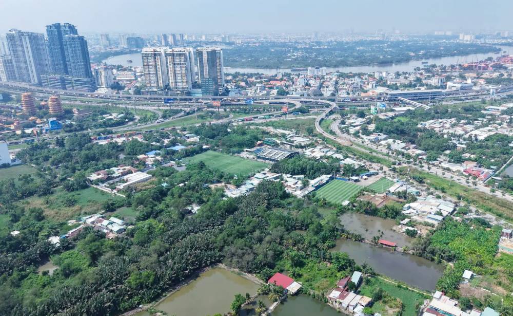 Từ trên cao, toàn bộ khu vực quy hoạch Khu Liên hợp thể dục thể thao quốc gia Rạch Chiếc vẫn chủ yếu là đất trống, ao hồ, kênh rạch.