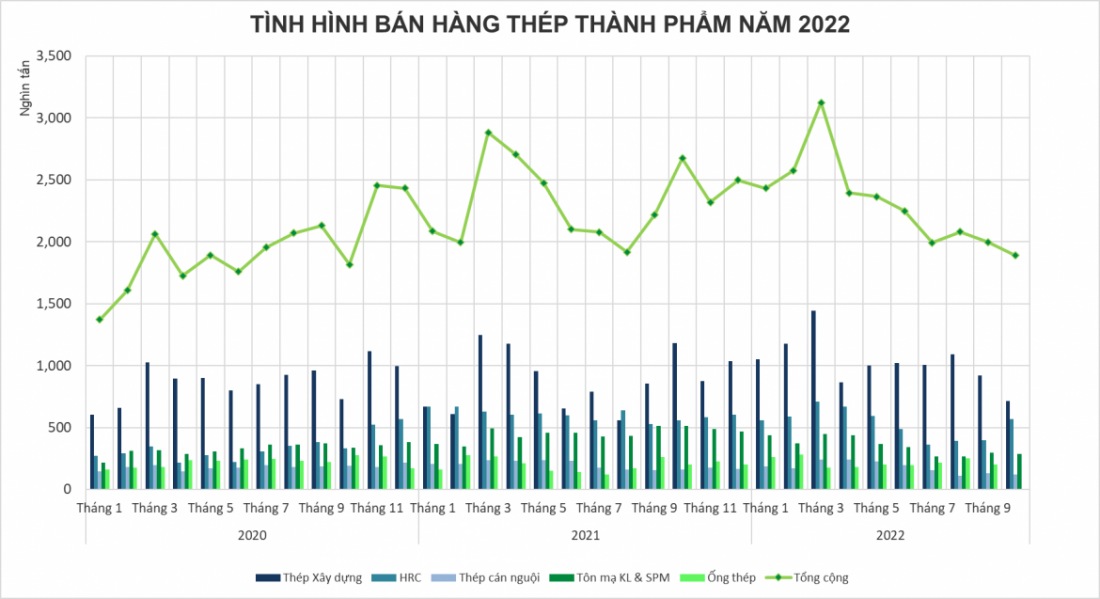 Số liệu từ Hiệp hội Thép Việt Nam (VSA) cho thấy doanh số bán hàng thép các loại trong tháng 10.2022 đạt gần 1,9 triệu tấn, giảm 5,53% so với tháng trước và giảm 29,4% so với cùng kỳ.