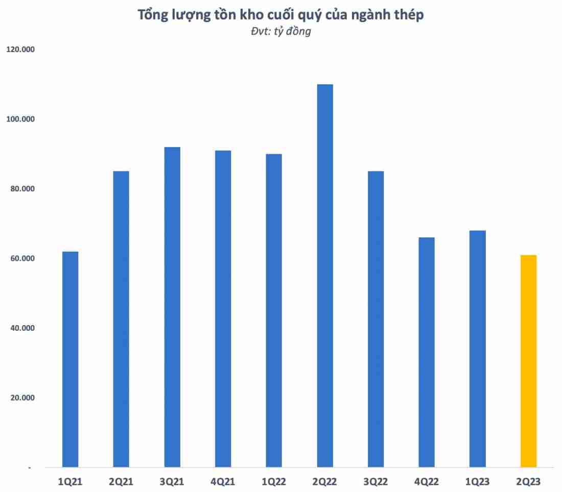 Tồn kho toàn ngành thép giảm xuống mức thấp nhất trong hơn 2 năm. Nguồn: Tổng hợp BCTC quý 2/2023