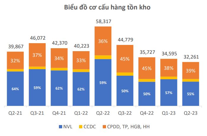 Tại thời điểm cuối quý 2/2023, hàng tồn kho của Hòa Phát ở mức 32.261 tỷ đồng, giảm 7% so với thời điểm cuối quý đầu năm và thấp hơn 50% so với cùng kỳ năm ngoái. Đây là mức thấp nhất trong 2 năm trở lại đây. Trong đó, nguyên vật liệu chiếm 46%, thành phẩm chiếm hơn 24%, còn lại là công cụ dụng cụ, hàng hóa, hàng mua đang đi trên đường, hàng gửi bán, và chi phí sản xuất kinh doanh dở dang.