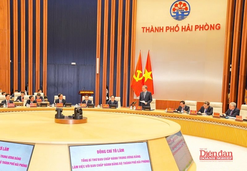 Tổng Bí thư Tô Lâm làm việc với Ban Chấp hành Đảng bộ thành phố Hải Phòng về tình hình phát triển kinh tế - xã hội và triển khai Nghị quyết Đại hội XIV của Đảng. Ảnh: Đàm Thanh