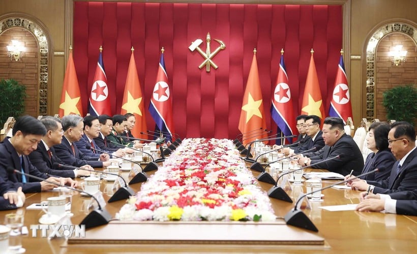 Tổng Bí thư Tô Lâm hội đàm với Tổng Bí thư, Chủ tịch Quốc vụ CHDCND Triều Tiên Kim Jong Un. Ảnh: TTXVN