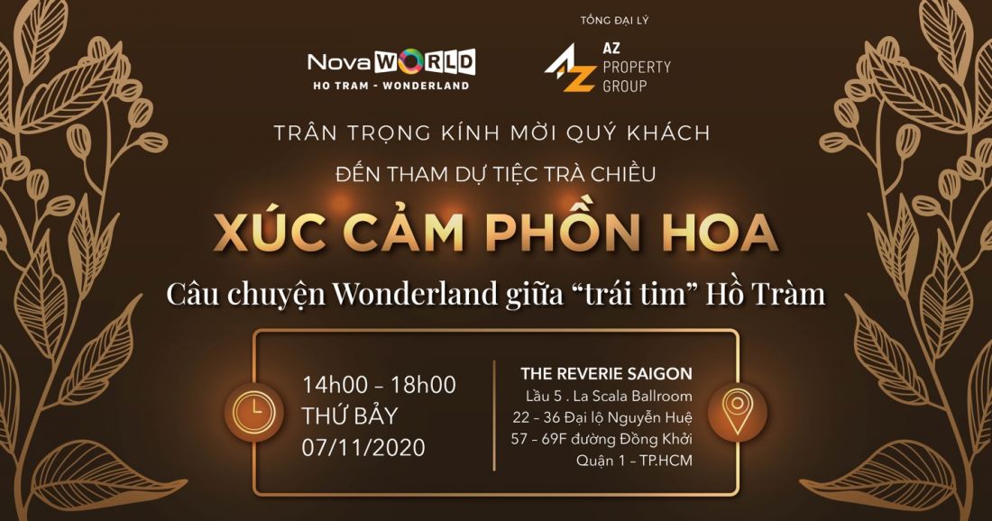 Vào thứ Bảy 07/11/2020 tới đây, AZ Property Group sẽ tổ chức sự kiện giới thiệu dự án NovaWorld Ho Tram Bình Châu– Wonderland với chủ đề Xúc Cảm Phồn Hoa – Câu chuyện Wonderland giữa “trái tim” Hồ Tràm - tái hiện không gian sang trọng, quý phái, náo nhiệt của “xứ sở thần tiên”. Mang lại cơ hội đầu tư với cam kết thuê lại hấp dẫn bởi Nova F&B lên đến 6 tỷ đồng trong 5 năm.