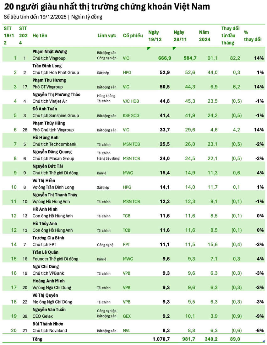 Tính đến ngày 19/12/2025, tổng giá trị tài sản của Top 20 người giàu nhất thị trường chứng khoán Việt Nam đạt hơn 1 triệu tỷ đồng, tăng 9% so với đầu tháng và 215% so với đầu năm.