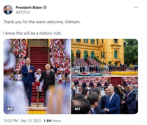 Tổng thống Biden viết: "Thank you for the warm welcome, Vietnam. I know this will be a historic visit” (tạm dịch: “Cảm ơn Việt Nam vì sự đón tiếp nồng hậu. Tôi biết rằng đây sẽ là chuyến công du lịch sử").