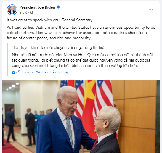Trên mạng xã hội Facebook, Tổng thống Mỹ chia sẻ: “It was great to speak with you, General Secretary. As I said earlier, Vietnam and the United States have an enormous opportunity to be critical partners. I know we can achieve the aspiration both countries share for a future of greater peace, security, and prosperity” (tạm dịch: “Thật tuyệt khi được nói chuyện với ông, ngài Tổng Bí thư. Như tôi đã nói trước đó, Việt Nam và Hoa Kỳ có một cơ hội lớn để trở thành đối tác quan trọng. Tôi biết chúng ta có thể đạt được nguyện vọng cả hai quốc gia cùng chia sẻ vì một tương lai hòa bình, an ninh và thịnh vượng lớn hơn”).