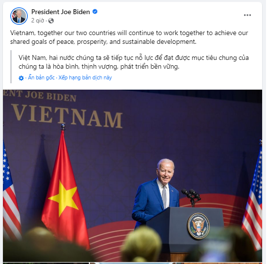 Tổng thống Mỹ Joe Biden viết về chuyến công du Việt Nam trên mạng xã hội Facebook.