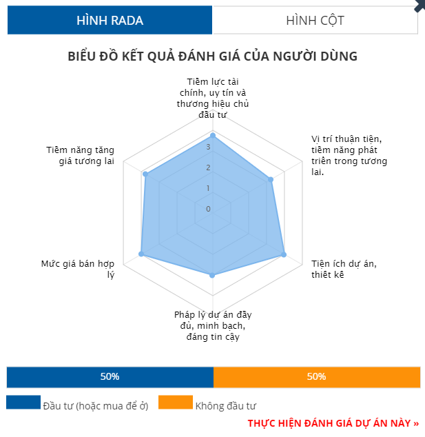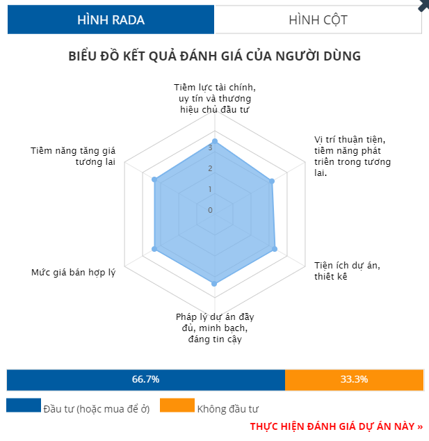 Từ biểu đồ kết quả đánh giá của người dùng cho thấy, dự án Hiệp Phước Harbour View được đánh giá với số điểm gần như ngang bằng nhau cho các tiêu chí: tiềm lực chủ đầu tư (3,5/5 điểm); vị trí dự án (3,2/5 điểm); tiện ích thiết kế dự án (3,3/5 điểm); pháp lý dự án (3,3/5 điểm); mức giá bán hợp lý (3,3/5 điểm); tiềm năng tăng giá trong tương lai (3,3/5 điểm).