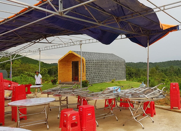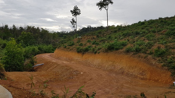 Ông giới thiệu tên L.V.H, đang giúp con trai là L.P.D.P quản lý dự án. Từ cổng, một con đường mới được san ủi chạy men theo triền đồi bên trái đến nhà điều hành.