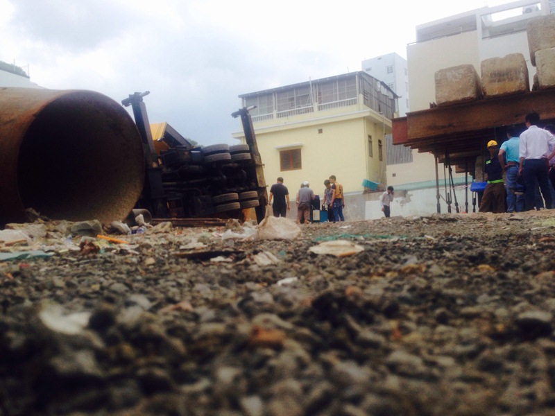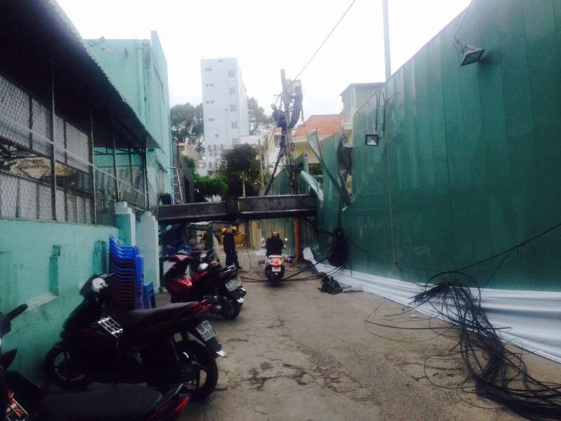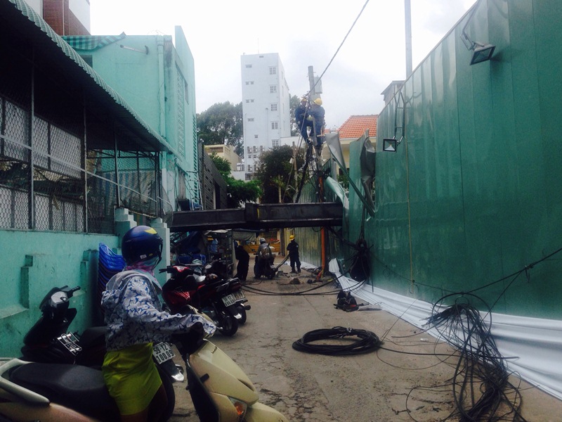 Chiếc cần cẩu đổ sập chắn ngang con hẻm kế bên dự án.