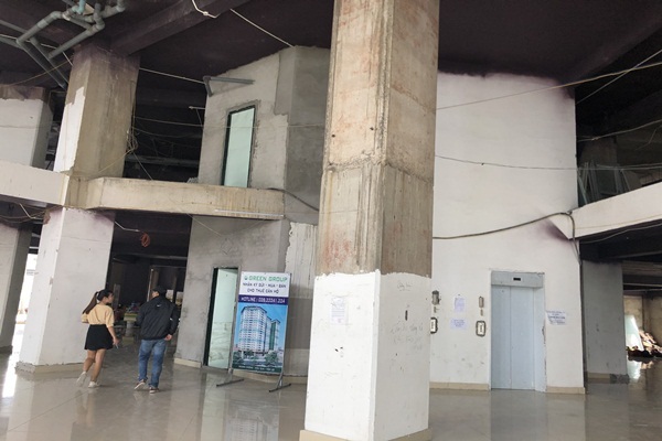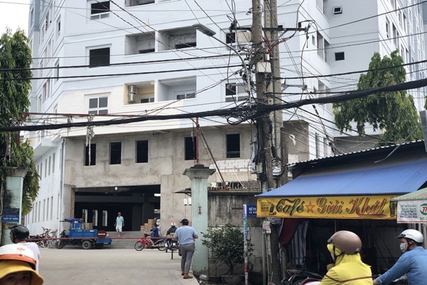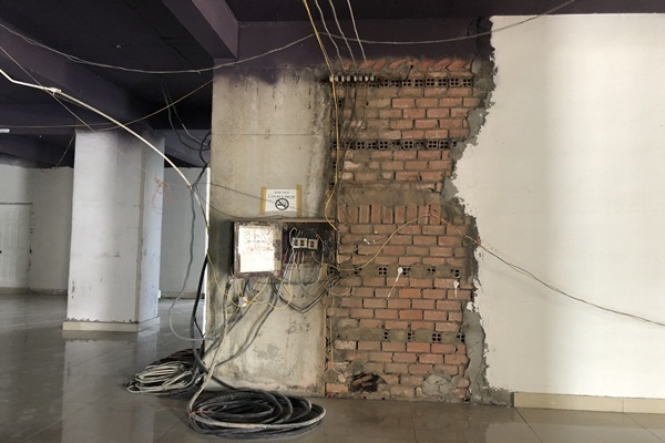 Ghi nhận tại công trình, phía ngoài mặt tiền cao ốc được phủ lớp sơn mới khá đẹp. Tuy nhiên, mặt tiền tầng dưới cùng của tòa nhà chưa hoàn thiện, tầng trệt có nhiều hạng mục đang thi công dang dở với nhiều dây điện, ổ điện, bê tông sắt thép để ngổn ngang không được che chắn.