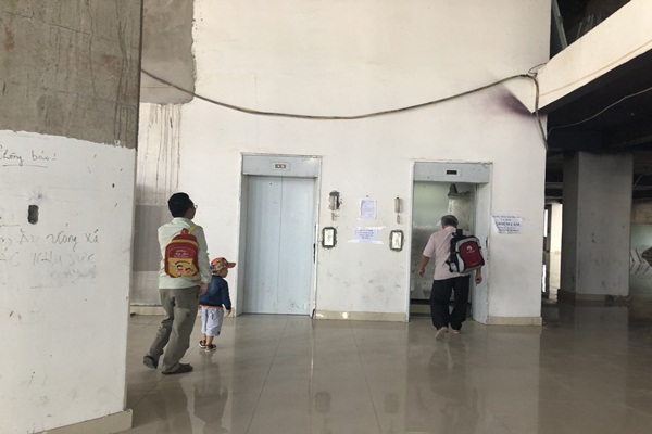 Đặc biệt là thang máy di chuyển của cư dân trông khá tạm bợ, khi di chuyển có dấu hiệu rung lắc nhẹ. Tuy nhiên, khi ra vào tòa nhà cư dân lại rất chủ quan, họ không đeo mũ bảo hiểm hay mặc đồ bảo hộ. Một số em nhỏ cũng đi cùng bố mẹ ra vào thang máy thường xuyên.
