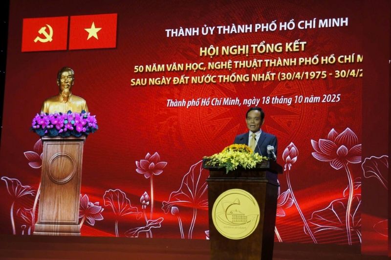 Bí thư Thành ủy TP.HCM Trần Lưu Quang tại Hội nghị tổng kết 50 năm văn học, nghệ thuật TP.HCM diễn ra vào sáng 18/10. Ảnh: Khánh Linh