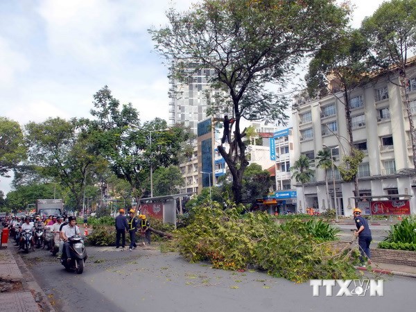 Hàng loạt cây xanh ở hai bên đường Lê Lợi-Nguyễn Huệ, quận 1, được di dời để xây dựng nhà ga ngầm thuộc Dự án tuyến đường sắt metro số 1. (Ảnh: Mạnh Linh/TTXVN)