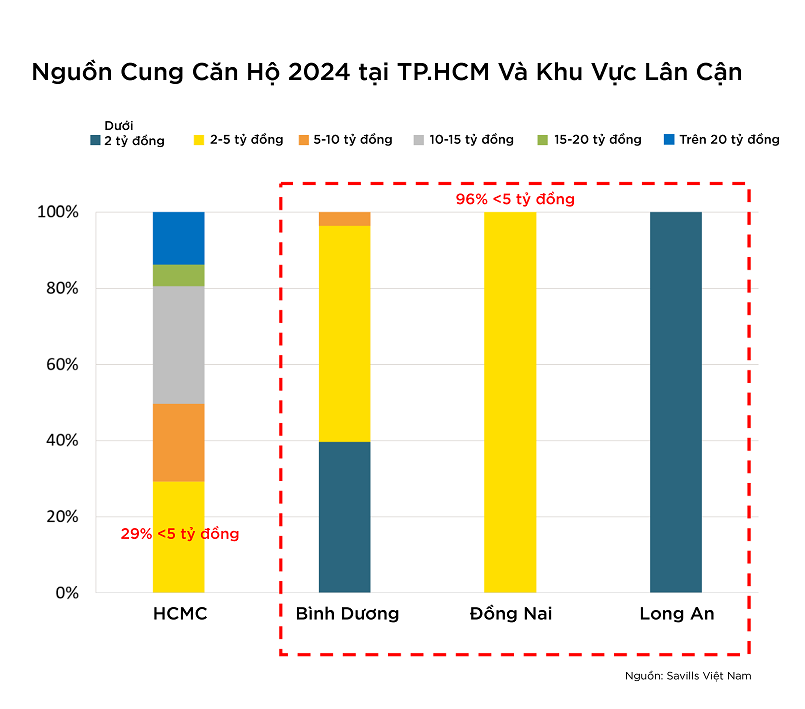 Theo bà Giang Huỳnh, trong năm 2024 có đến 96% nguồn cung tương lai ở Bình Dương, Đồng Nai và Long An nằm ở phân khúc giá dưới 5 tỷ đồng/căn. Do đó, đây được xem là lời giải cho “cơn khát” nhà ở giá rẻ tại khu vực TP.HCM.