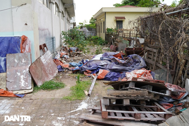 Khung cảnh nhếch nhác, rác thải xây dựng tràn ngập, cây cỏ mọc um tùm phía sau các tòa nhà tái định cư bỏ hoang (Ảnh: Ngọc Huyền).