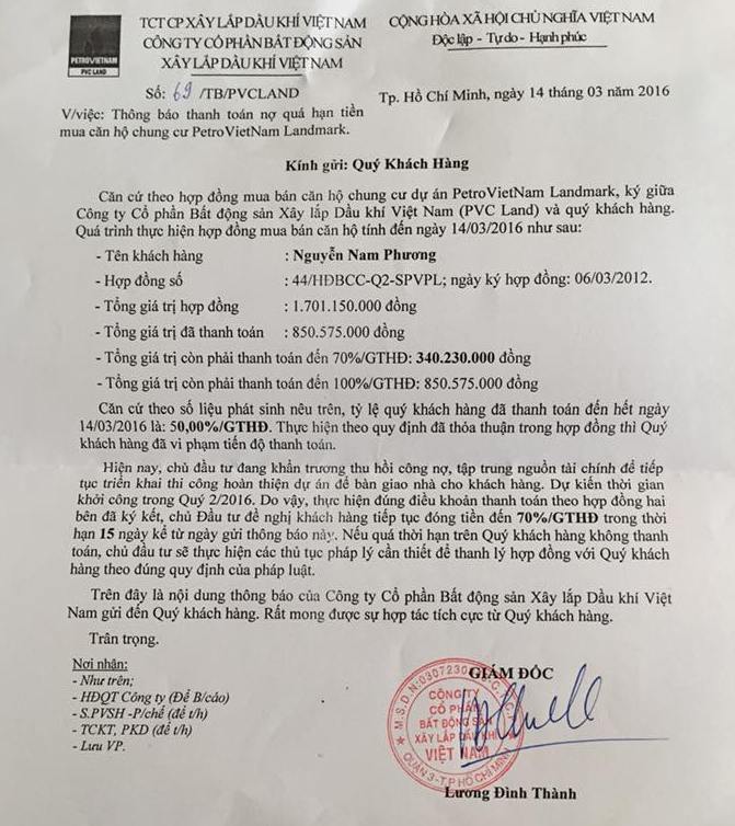 Tương tự, với khách hàng Dương Trường An mua căn hộ 1,7 tỷ đồng, đã thanh toán hơn 510 triệu đồng, PVC Land cũng gửi văn bản yêu cầu anh An phải thanh toán tiếp hơn 680 triệu đồng.