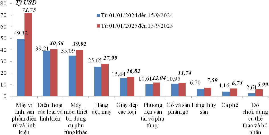 Trị giá xuất khẩu của một số nhóm hàng lớn lũy kế từ từ 01/01/2025 đến 15/9/2025 và cùng kỳ năm 2024. Nguồn: Cục Hải quan