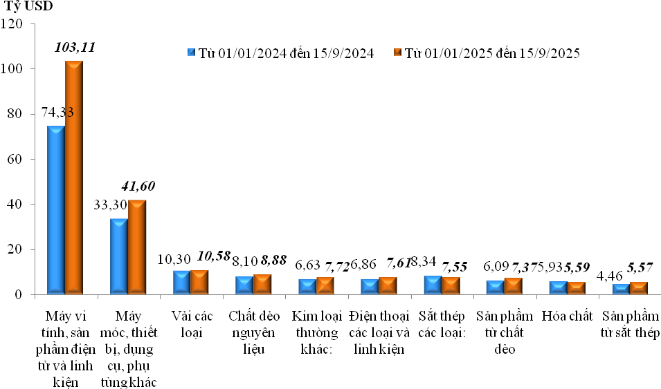 Trong đó một số nhóm hàng tăng mạnh như: máy vi tính, sản phẩm điện tử & linh kiện tăng 28,78 tỷ USD, tương ứng tăng 38,7%; máy móc thiết bị dụng cụ và phụ tùng tăng 8,3 tỷ USD, tương ứng tăng 24,9% so với cùng kỳ năm 2024.