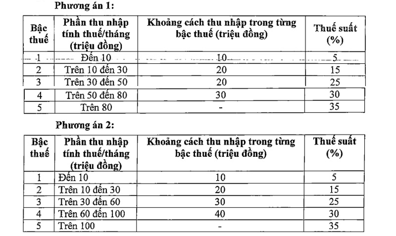 Tại dự thảo Luật Thuế thu nhập cá nhân (sửa đổi) mới nhất, Bộ Tài chính trình Chính phủ mức thuế tối thiểu 5% tương ứng với thu nhập tính thuế trong tháng là 10 triệu đồng (sau khi giảm trừ gia cảnh, chi phí tính thuế khác). Thuế suất tối đa là 35%, với thu nhập tính thuế trên 100 triệu. Biểu thuế lũy tiến được rút gọn xuống còn 5 bậc.