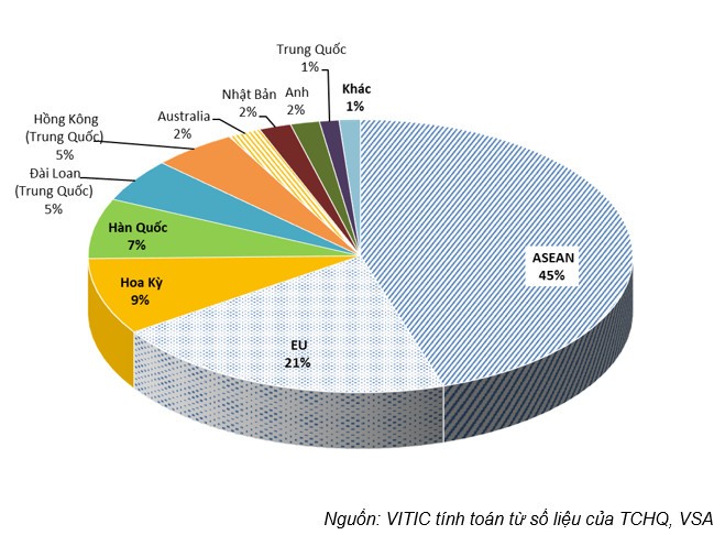 Cụ thể, các thị trường xuất khẩu chính gồm: ASEAN chiếm 45,1%; Khu vực EU là 20,51%, Mỹ chiếm 9,1%; Hàn Quốc chiếm 7,14% và Đài Loan ước khoảng 5,16%.