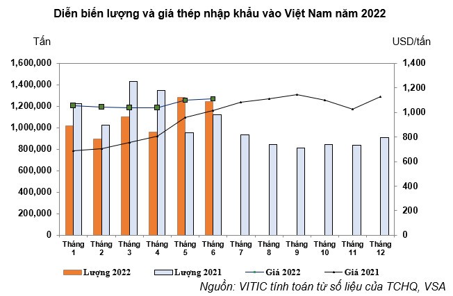 Hết nửa năm 2022, nhập khẩu thép thành phẩm các loại về Việt Nam đạt khoảng 6,49 triệu tấn với trị giá hơn 6,97 tỉ USD, giảm 8,6% về lượng nhưng tăng 20,32% về trị giá so với cùng kỳ năm 2021.