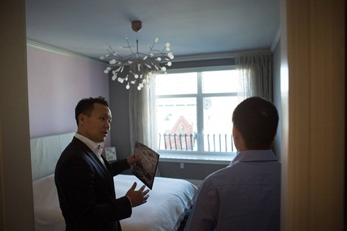 Một nhân viên môi giới đang giới thiệu căn hộ cho khách hàng tại New York. Ảnh:WSJ