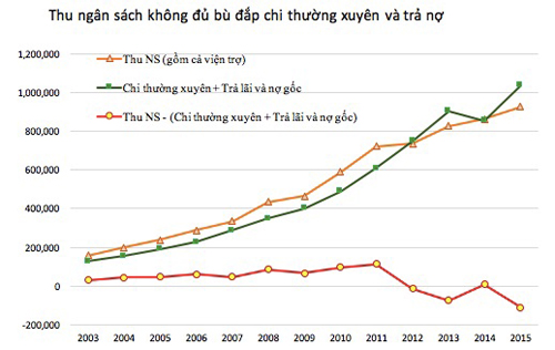 Thứ nhất, trong khi tỷ lệ huy động từ thuế so với GDP giảm khoảng 5 điểm phần trăm thì nguồn thu từ phí lại tăng 2,5 điểm phần trăm, khiến cho tỷ lệ huy động từ thuế và phí cộng lại lên tới 21,8% GDP. Thứ hai, và quan trọng hơn, vấn đề thâm hụt ngân sách và nợ công của Việt Nam bắt nguồn chủ yếu từ việc tăng chi tiêu quá nhanh. Cụ thể là trong giai đoạn 2010-2015, trong khi tốc độ tăng thu ngân sách danh nghĩa trung bình chỉ là 9,5% thì tốc độ tăng của trả nợ gốc và lãi là 13,6%, còn của chi thường xuyên lên tới 16,7%. Nếu như vào năm 2010, chi thường xuyên chỉ chiếm 51,1% tổng chi ngân sách, thì đến năm 2015, tỷ lệ này đã lên tới 61,5%.