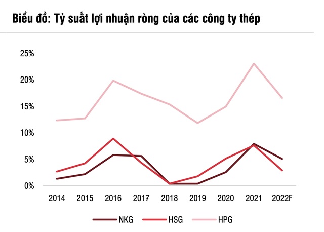 Tương tự với Tập đoàn Hoa Sen, SSI Research đưa ra dự báo lợi nhuận sau thuế năm 2022 của doanh nghiệp này ở mức 1.400 tỉ đồng, giảm 67% so với cùng kỳ năm ngoái. Ngoài ra, sản lượng tiêu thụ của Hoa Sen sẽ giảm 12,7% xuống 1,96 triệu tấn, chủ yếu do sản lượng xuất khẩu giảm 26% so với mức đỉnh vào năm 2021.