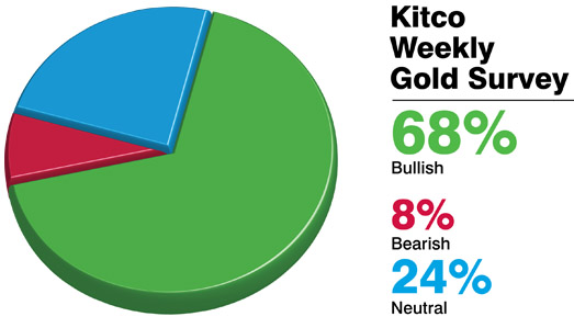 Trong cuộc khảo sát của hãng tin Kitco về hướng đi giá vàng trong tuần tới, có tới 17/25 người (chiếm 68% ý kiến) dự báo giá sẽ tăng trong khi chỉ có 2 người dự báo giá vàng giảm (chiếm 8%) và 6 người dự báo giá vàng sẽ đi ngang (chiếm 24%) .