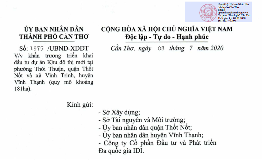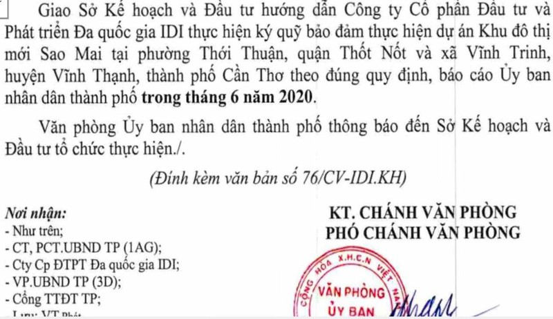 UBND TP cũng giao Sở Xây dựng, Sở Tài nguyên và Môi trường, UBND quận Thốt Nốt, UBND huyện Vĩnh Thạnh đôn đốc, hỗ trợ Công ty Cổ phần Đầu tư và Phát triển Đa quốc gia IDI triển khai đầu tư dự án nêu trên theo đúng quy định, giải quyêt các vướng mắc của dự án theo thẩm quyền.