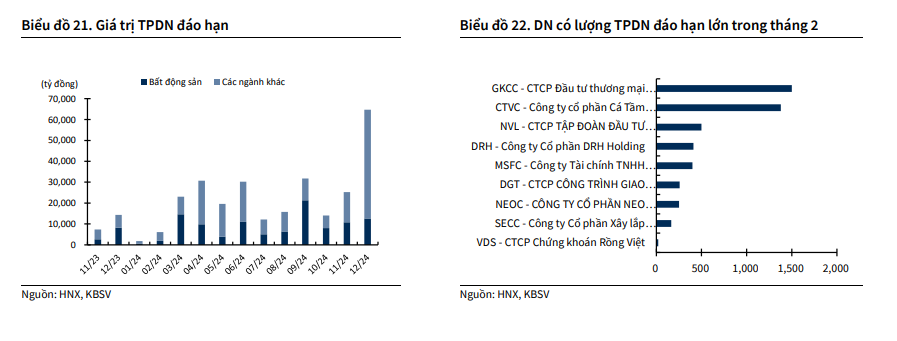 Trong tháng 2, dự tính sẽ có khoảng 4,88 nghìn tỷ đồng trái phiếu đáo hạn (+335% MoM). Trong đó, nhóm Bất động sản chiếm 49% và lĩnh vực khác chiếm 31%.
