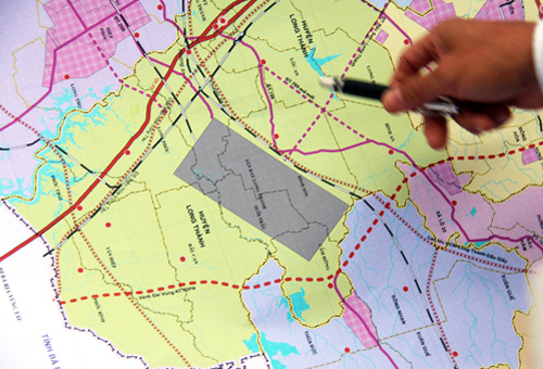 Bản đồ vị trí dự kiến của Sân bay quốc tế Long Thành (hình chữ nhật màu xám). Ảnh: Hữu Công