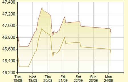 Diễn biến giá vàng SJC trong 7 phiên gần nhất, tính đến 9h45 hôm nay, 21/9/2012 (đơn vị: nghìn đồng/lượng) - Ảnh: SJC. |