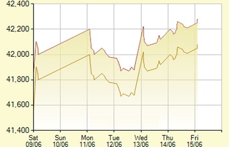 Diễn biến giá vàng SJC trong 7 phiên gần nhất, tính đến 10h15 hôm nay, 15/6/2012 (đơn vị: nghìn đồng/lượng) - Ảnh: SJC.