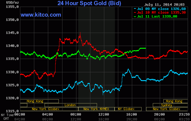 Sáng nay 7:00 theo giờ Việt Nam, giá vàng giao ngay trên sàn Kitco đứng tại 1.339USD, tăng 3,7USD, tương đương 0,3% so với chốt phiên trước.