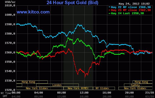 Chốt phiên 24/5, giá vàng giao tháng 6 có được 0,5% lên 1.557,5 USD/ounce. Trong phiên, có lúc giá lên 1.570,7 USD.