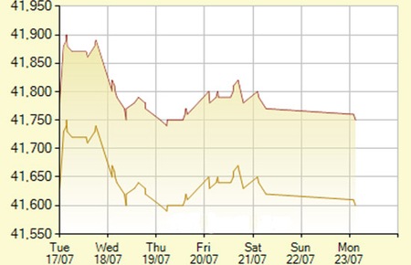 Diễn biến giá vàng SJC trong 7 phiên gần nhất, tính đến 9h hôm nay, 23/7/2012 (đơn vị: nghìn đồng/lượng) - Ảnh: SJC.
