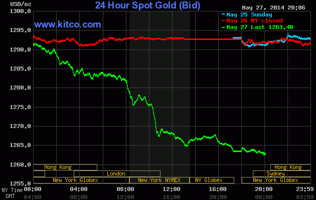 Giá vàng giao tháng Sáu trượt 26,2USD, tương đương 2%, xuống còn 1.265,5USD/oz trên sàn Comex tại sở giao dịch New York Mercantile.
