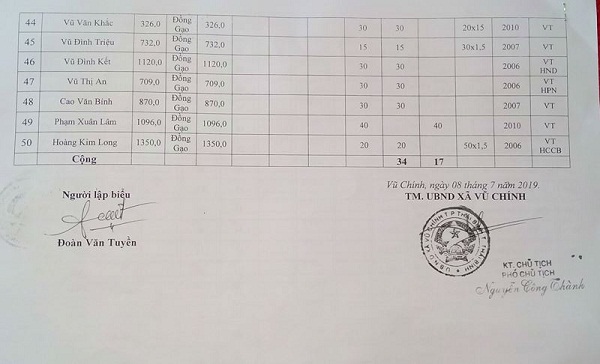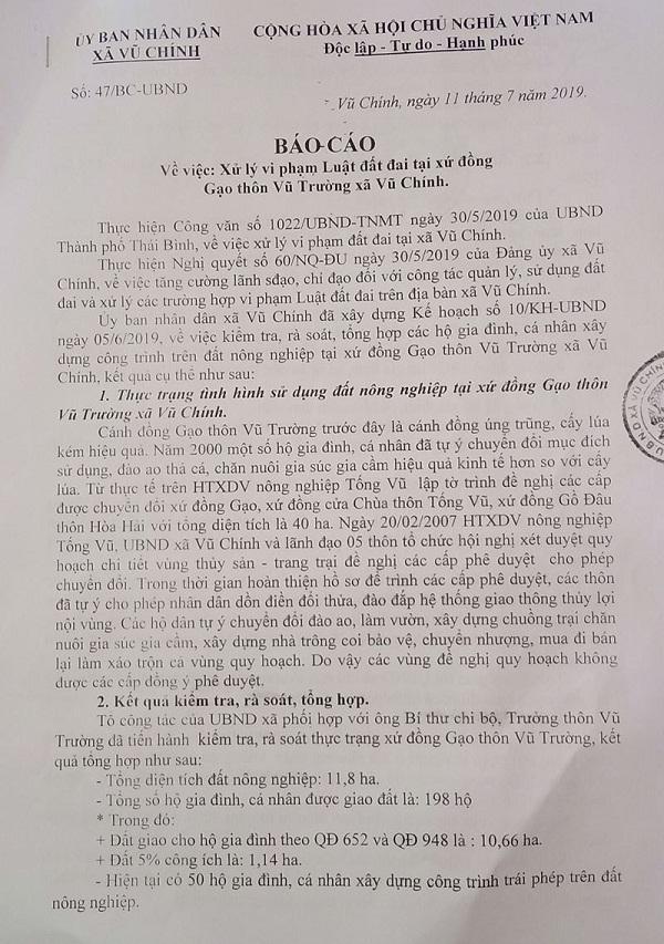 Theo báo cáo số 47/BC-UBND ngày 11/7/2019 của UBND xã Vũ Chính, sau khi tiến hành kiểm tra, rà soát, hiện ở khu vực xứ Đồng Gạo, thôn Vũ Trường, tổng diện tích 11,8ha đất nông nghiệp trước đây giao cho 198 hộ dân nay đã được chuyển nhượng qua lại nhiều lần, các hộ tự ý chuyển nhượng, đa số không có xác nhận của chính quyền địa phương.