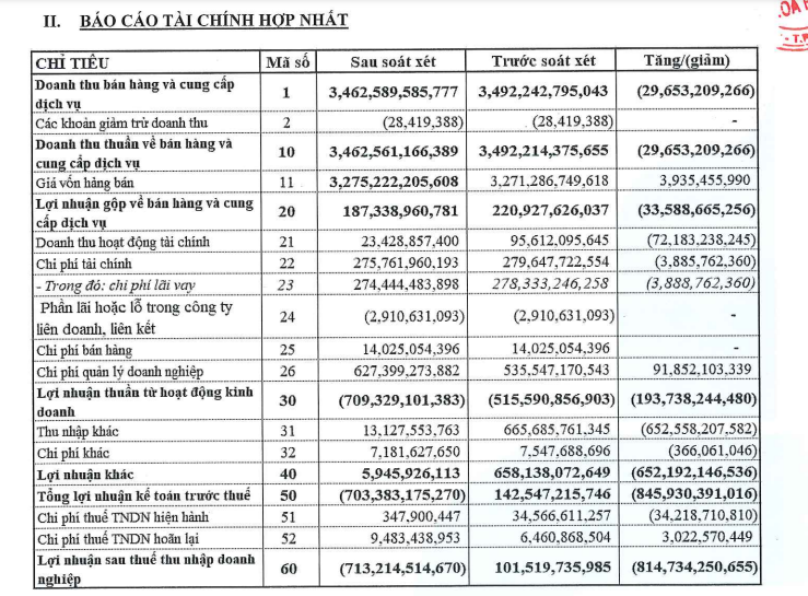 Cụ thể, trong báo cáo tài chính soát xét bán niên, doanh nghiệp lỗ 713 tỷ đồng. Trong khi đó, ở báo cáo tự lập doanh nghiệp báo lãi hơn 103 tỷ đồng.