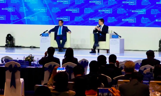 Thủ tướng Phạm Minh Chính đối thoại với Giám đốc điều hành Diễn đàn Kinh tế Thế giới Stephan Mergenthaler. Ảnh: Hoàng Hùng