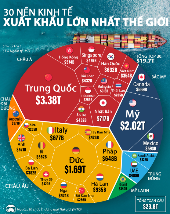 Với kim ngạch xuất khẩu hàng hóa 354 tỷ USD, Việt Nam nằm trong top 30 nền kinh tế xuất khẩu lớn nhất thế giới với vị trí 23, chiếm tỷ trọng 1,5% toàn cầu.