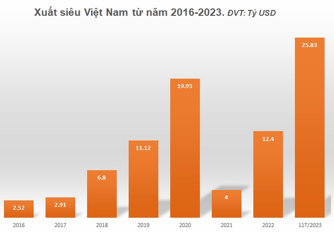 Việt Nam xuất siêu 8 năm liên tiếp.Nguồn số liệu: Tổng cục Hải quan