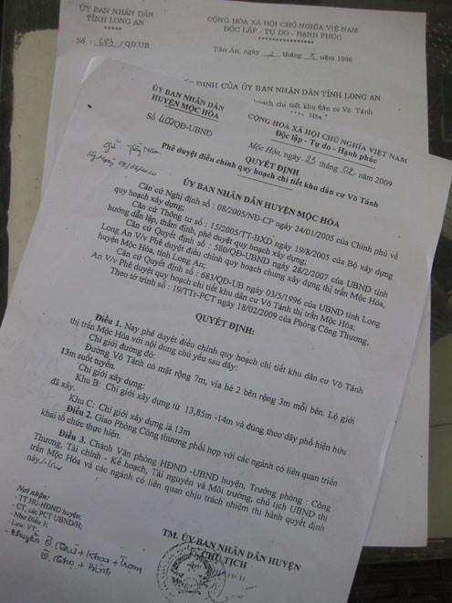 Nhưng cái đáng nói ở đây là, năm 1996, UBND tỉnh Long An quyết định “Phê duyệt quy hoạch chi tiết khu dân cư Võ Tánh thị trấn Mộc Hóa” chứ không phải UBND huyện Mộc Hóa. Khoản 2 Điều 29 cũng quy định: “Khi điều chỉnh quy hoạch chi tiết xây dựng, người có thẩm quyền phê duyệt phải lấy ý kiến của nhân dân thông qua phiếu xin ý kiến hoặc tổ chức họp đại diện tổ dân phố và Uỷ ban nhân dân phường trong khu vực liên quan đến quy hoạch điều chỉnh”.