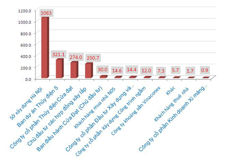 Trong đó, khoản phải thu của Sở xây dựng Hà Nội là 1.063 tỷ đồng. Còn khoản phải thu của 2 đơn vị ngành điện là Công ty cổ phần Thủy điện Cửa Đạt và Ban dự án Thủy điện 5 (Buôn Tuarash, Buôn Kuốp) lần lượt là 274 tỷ và 321,1 tỷ đồng. Trong đó, Ban dự án Thủy điện 5 thuộc Tập đoàn Điện lực Việt Nam - EVN.