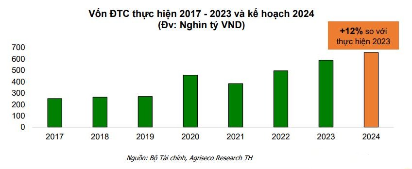 “Năm 2024 cũng là năm thứ 4 triển khai thực hiện Kế hoạch vốn đầu tư Ngân sách Nhà nước giai đoạn 2021 - 2025 (khoảng 2,87 triệu tỷ đồng). Hiện vốn đầu tư từ Ngân sách Nhà nước thực hiện 2021 - 2023 ước khoảng 1,57 triệu tỷ đồng, để hoàn thành kế hoạch thì trong 2 năm tới sẽ cần giải ngân khoảng 1,3 triệu tỷ đồng”, Agriseco cho hay.