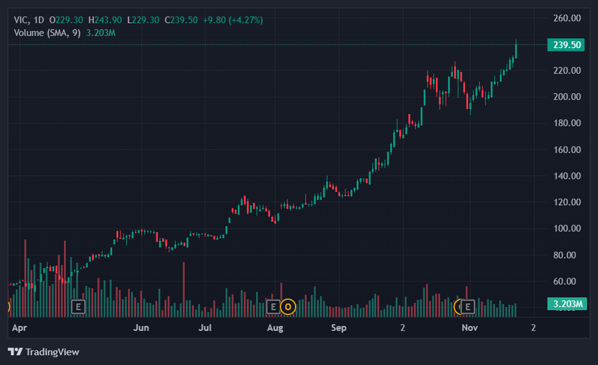Cổ phiếu Vingroup đạt đỉnh lịch sử mới gần 240.000 đồng/cổ phiếu. Ảnh: TradingView