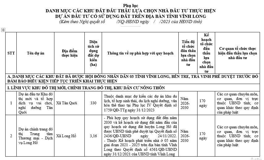 2. Dự án chỉnh trang đô thị Trung tâm Thương mại - Dịch vụ Long Hồ có diện tích 3,16 ha tại xã Long Hồ. Dự án phù hợp quy hoạch sử dụng đất đến năm 2030 và kế hoạch sử dụng đất năm đầu của quy hoạch sử dụng đất huyện Long Hồ đã được UBND tỉnh phê duyệt tại Quyết định số 2436/QĐ-UBND ngày 24/11/2022; thuộc Kế hoạch phát triển nhà ở 05 năm giai đoạn 2021-2025 trên địa bàn tỉnh Vĩnh Long theo Quyết định số 4561/QĐ-UBND ngày 31/12/2021. Kế hoạch đấu thầu lựa chọn nhà đầu tư trong 170 ngày.