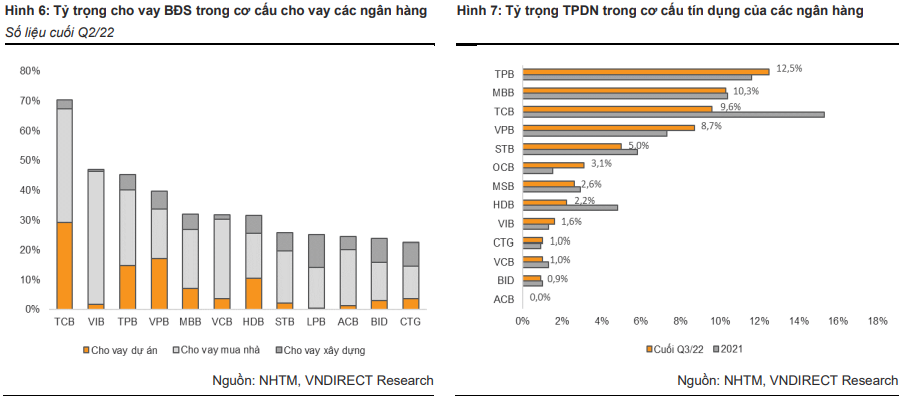 VnDirect cho rằng, khi các cuộc kiểm tra và đánh giá rủi ro đối với mỗi ngân hàng sẽ được thực hiện gắt gao hơn, các ngân hàng có tỷ trọng cho vay bất động sản và nắm giữ TPDN trong danh mục tín dụng thấp sẽ gặp ít “áp lực” hơn trong việc thúc đẩy tăng trưởng cho vay trong năm 2023-2024.